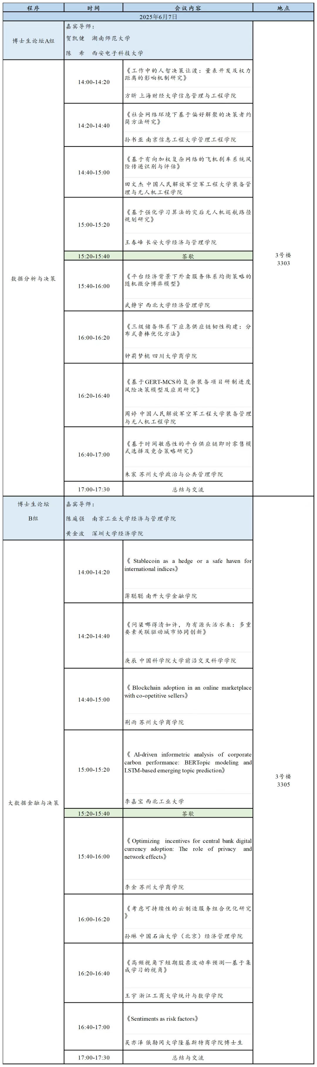 第十七届中国决策科学学术年会将于2025年6月6日至8日在江苏省苏州市的苏州市会议中心举行,本次学术年会由中国运筹学会决策科学分会、中国管理现代化研究会管理与决策科学专业委员会、苏州大学联合主办。本次年会旨在探讨决策科学理论与方法及其相关领域应用的最新研究成果,加强国内外管理与决策科学学科专家学者的交流与合作,促进管理与决策科学学科的交叉、渗透和发展。本次年会的主题为“人工智能时代的决策理论与方法”,我们热忱欢迎大家参加本次学术年会。年会安排如下: