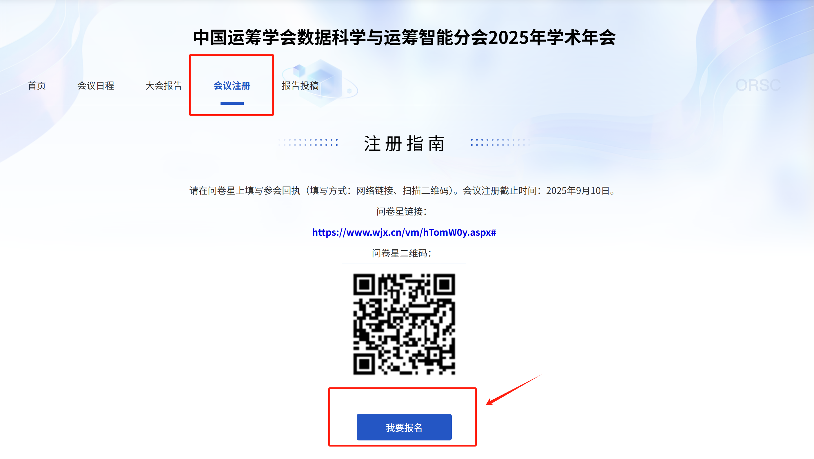 请登录中国运筹学会会议管理系统(https://conf.orsc.org.cn/)进行会议报名后【详细操作步骤见十、会议费用】,在问卷星上填写参会回执(填写方式:网络链接、扫描二维码)。会议注册截止时间:2025年9月21日。